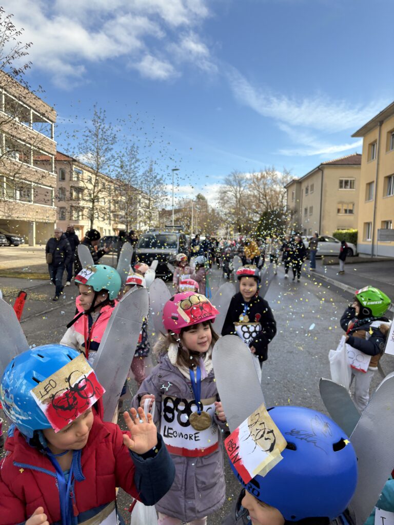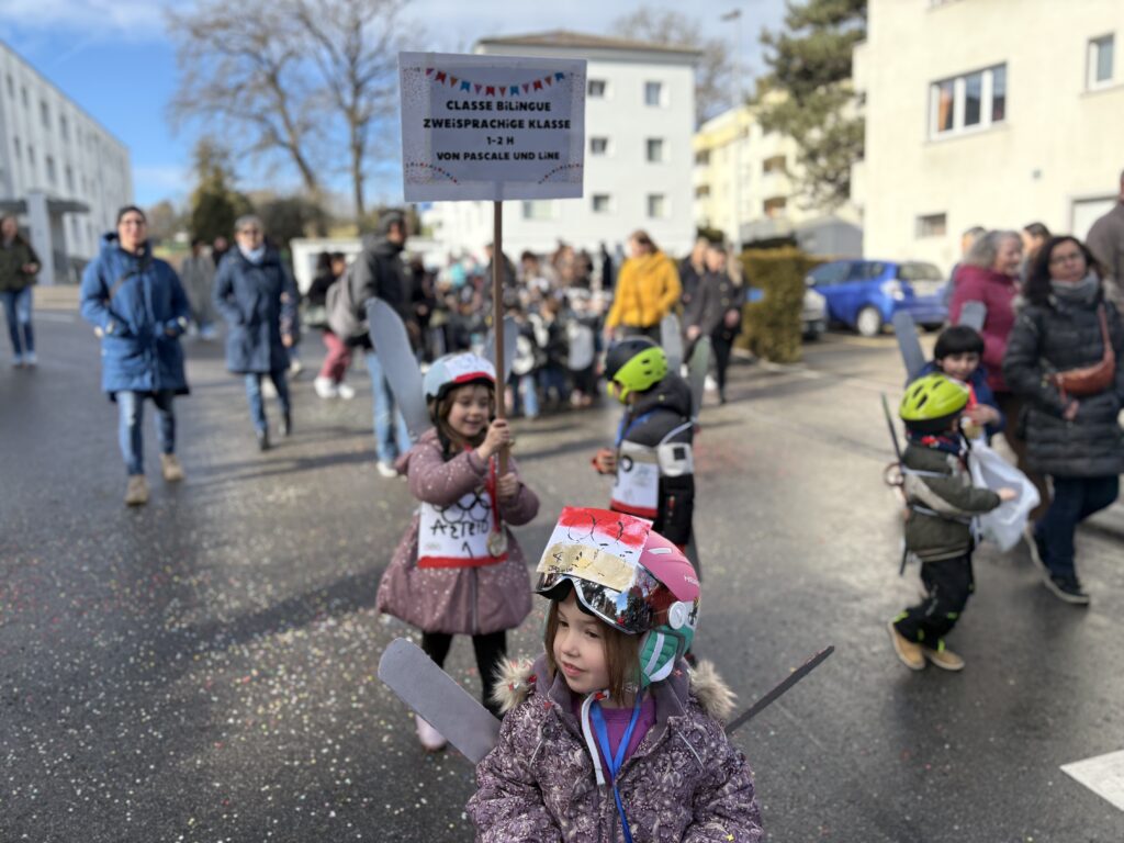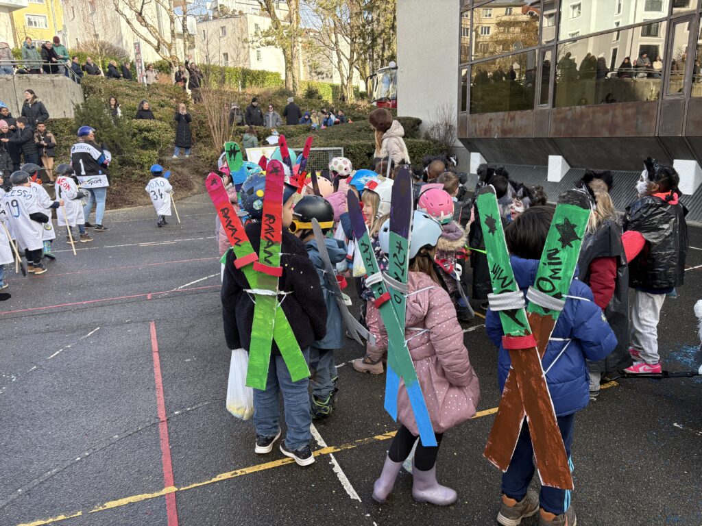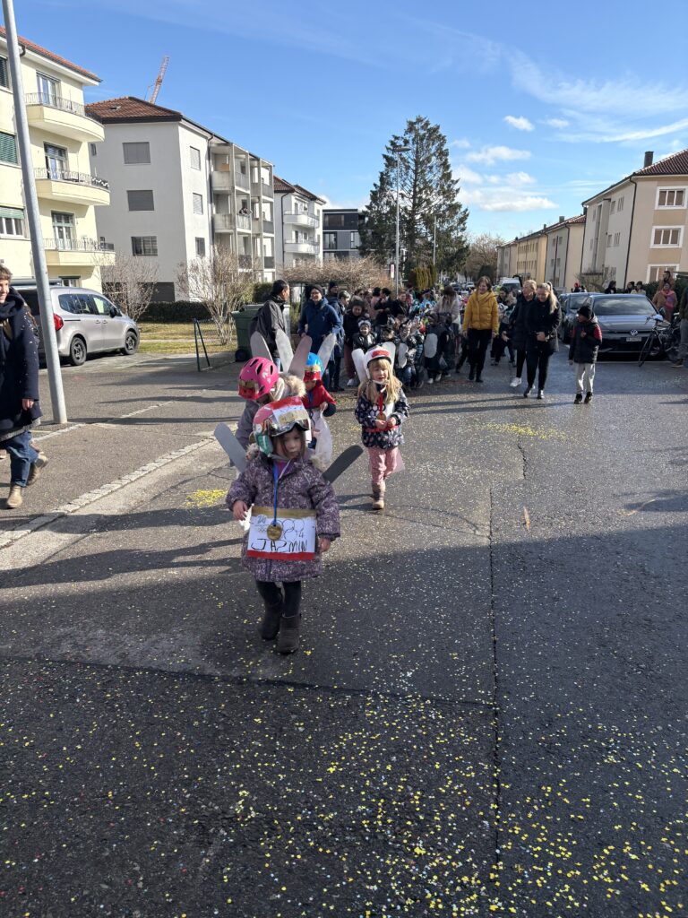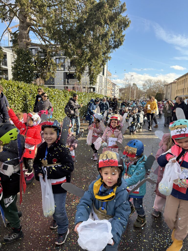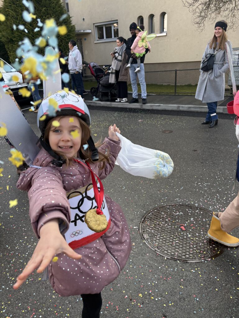 Am 6. Februar fand unser Umzug im Quartier statt. Zwischen den bunten Kostümen der anderen Klassen zogen unsere Skifahrer mit Helm, Startnummer und Medaille fröhlich durch die Strassen und warfen Konfetti. Gemeinsam waren wir unterwegs und hatten viel Spass.