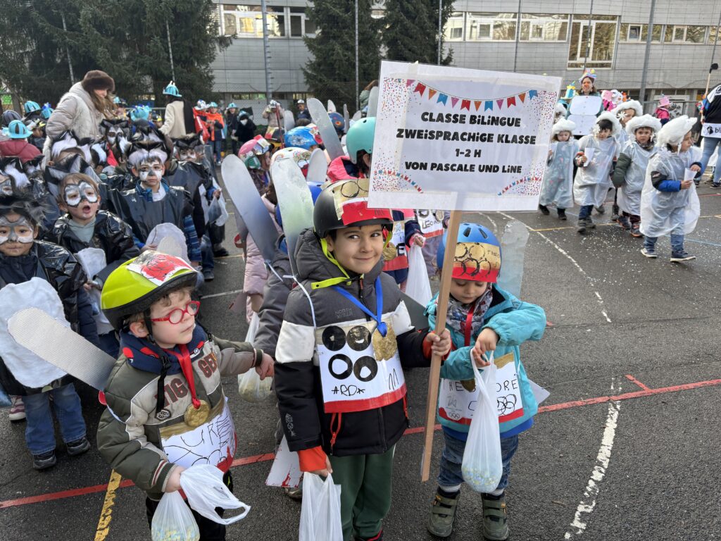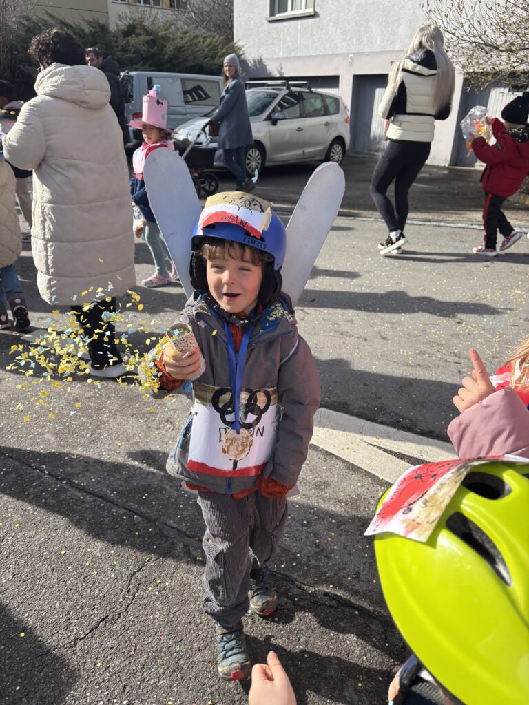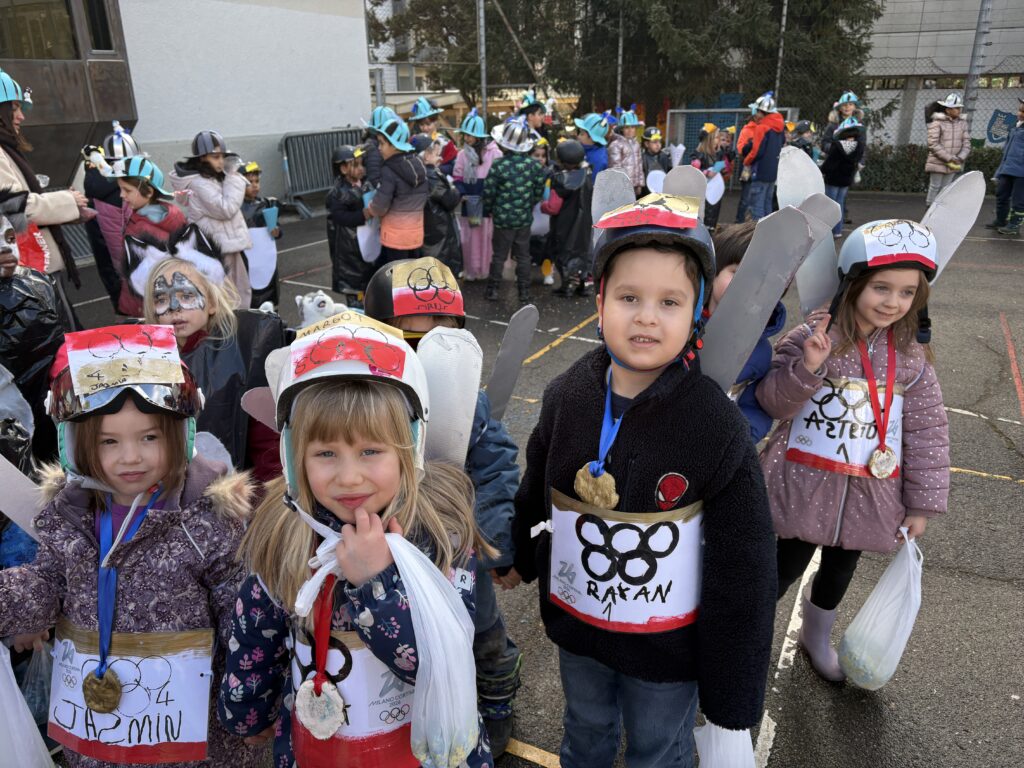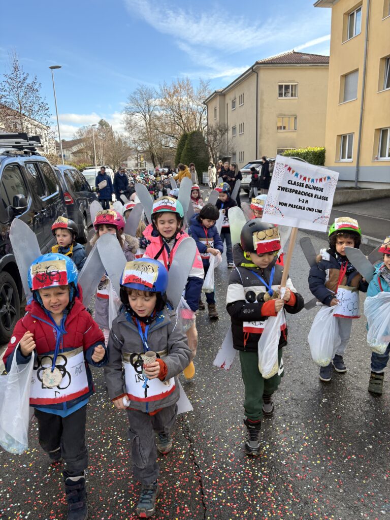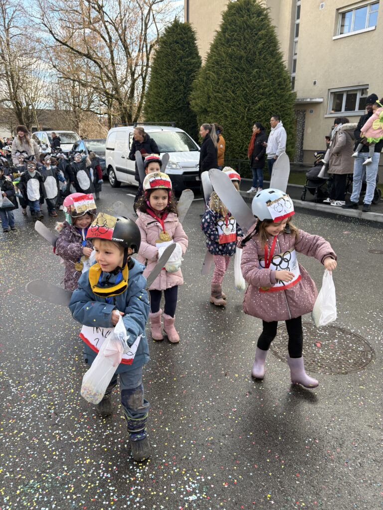 Am 6. Februar fand unser Umzug im Quartier statt. Zwischen den bunten Kostümen der anderen Klassen zogen unsere Skifahrer mit Helm, Startnummer und Medaille fröhlich durch die Strassen und warfen Konfetti. Gemeinsam waren wir unterwegs und hatten viel Spass.