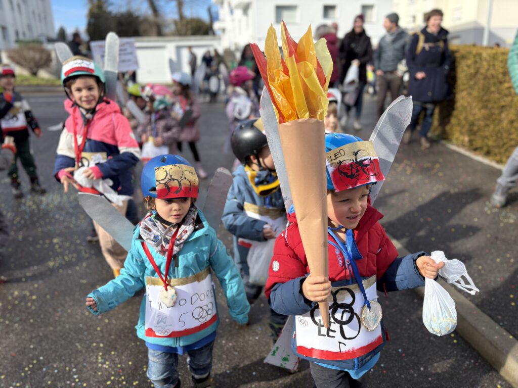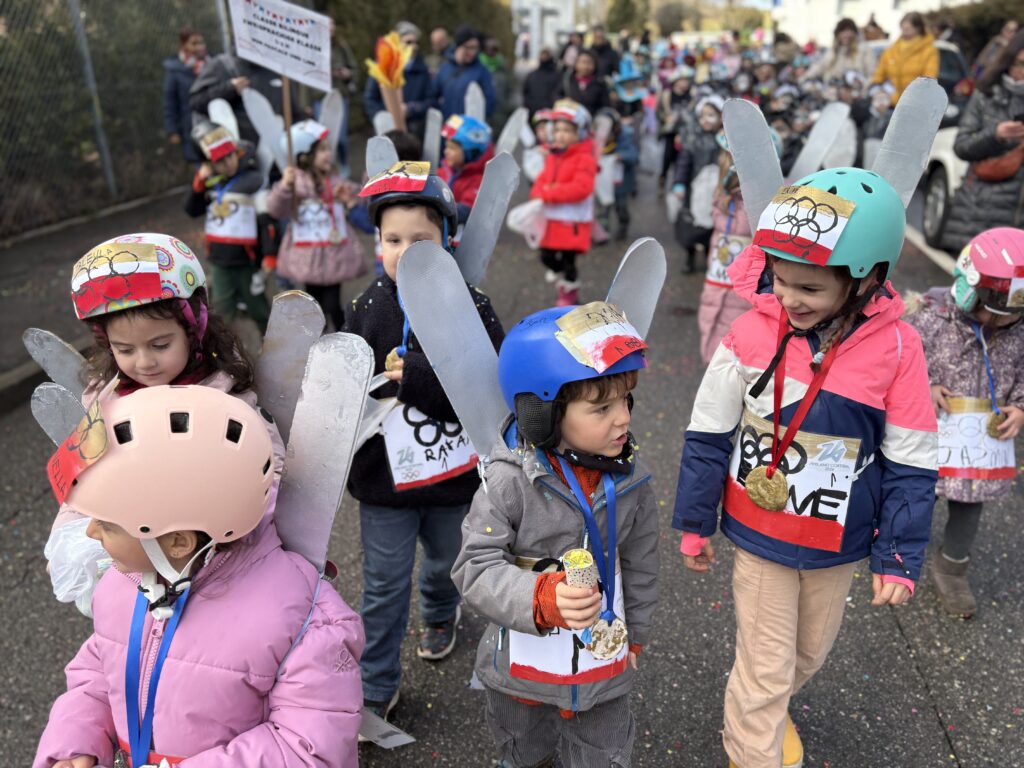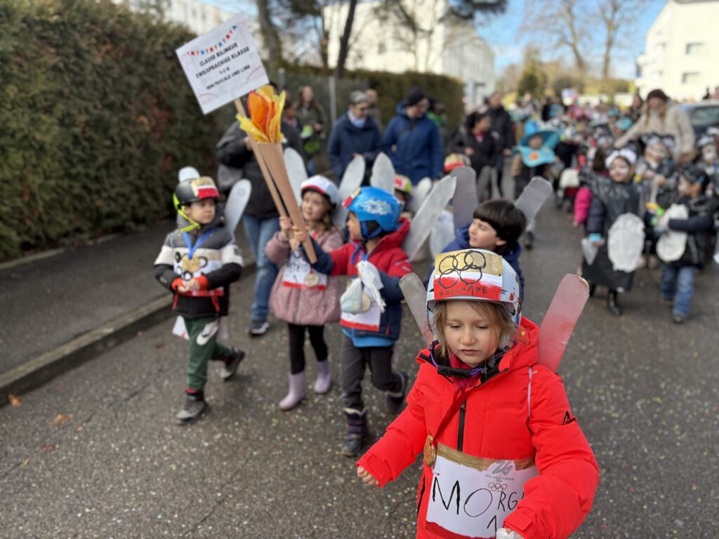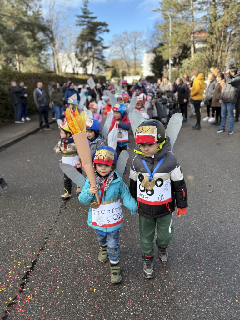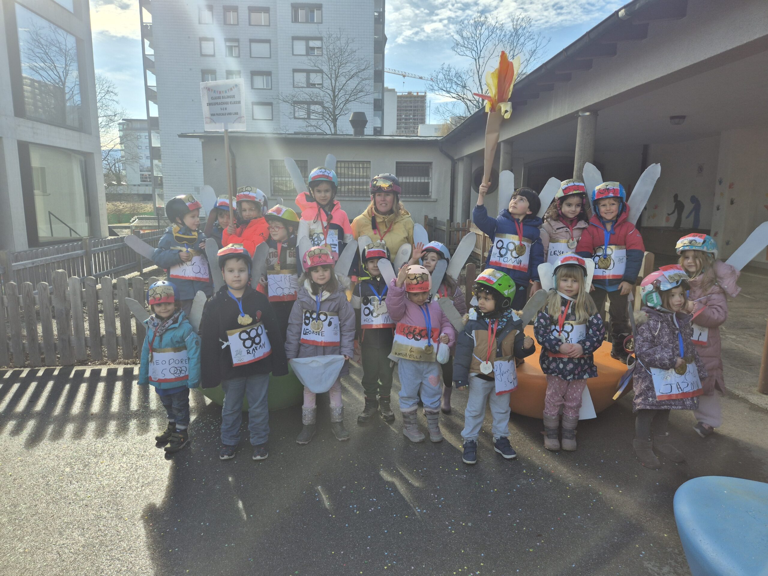 Am 6. Februar fand unser Umzug im Quartier statt. Zwischen den bunten Kostümen der anderen Klassen zogen unsere Skifahrer mit Helm, Startnummer und Medaille fröhlich durch die Strassen und warfen Konfetti. Gemeinsam waren wir unterwegs und hatten viel Spass.