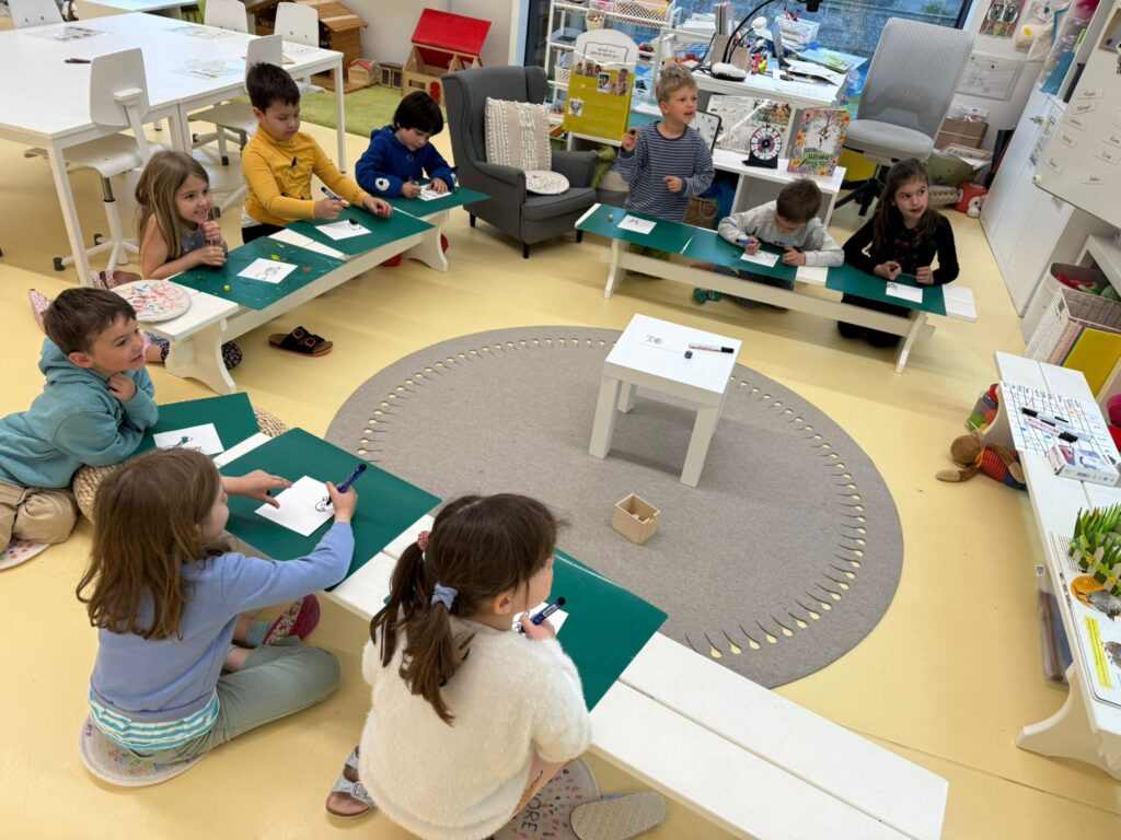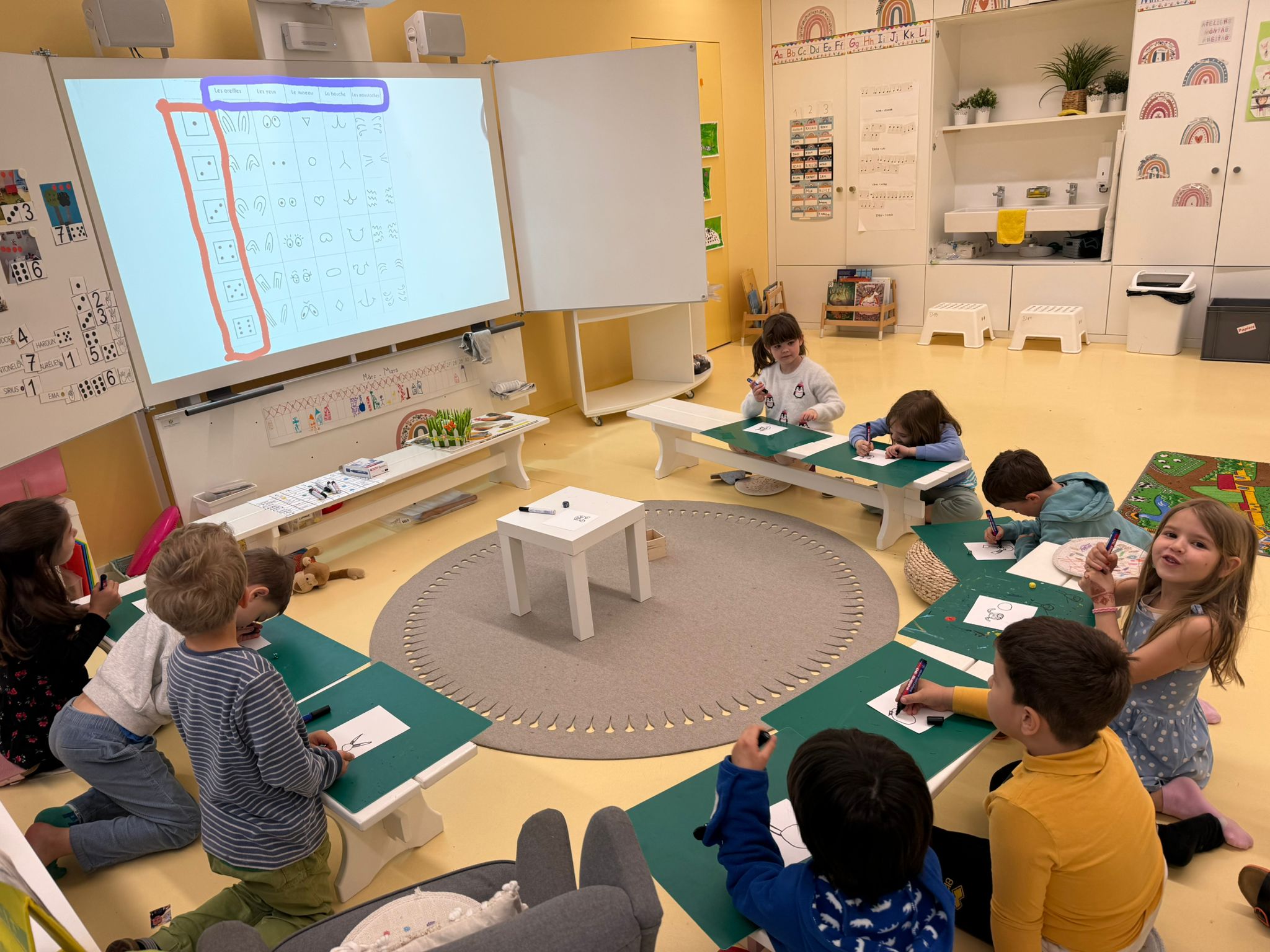 8h00 : Accueil collectif. Tomin est notre assistant du jour ; il prépare le calendrier. Bravo à lui!