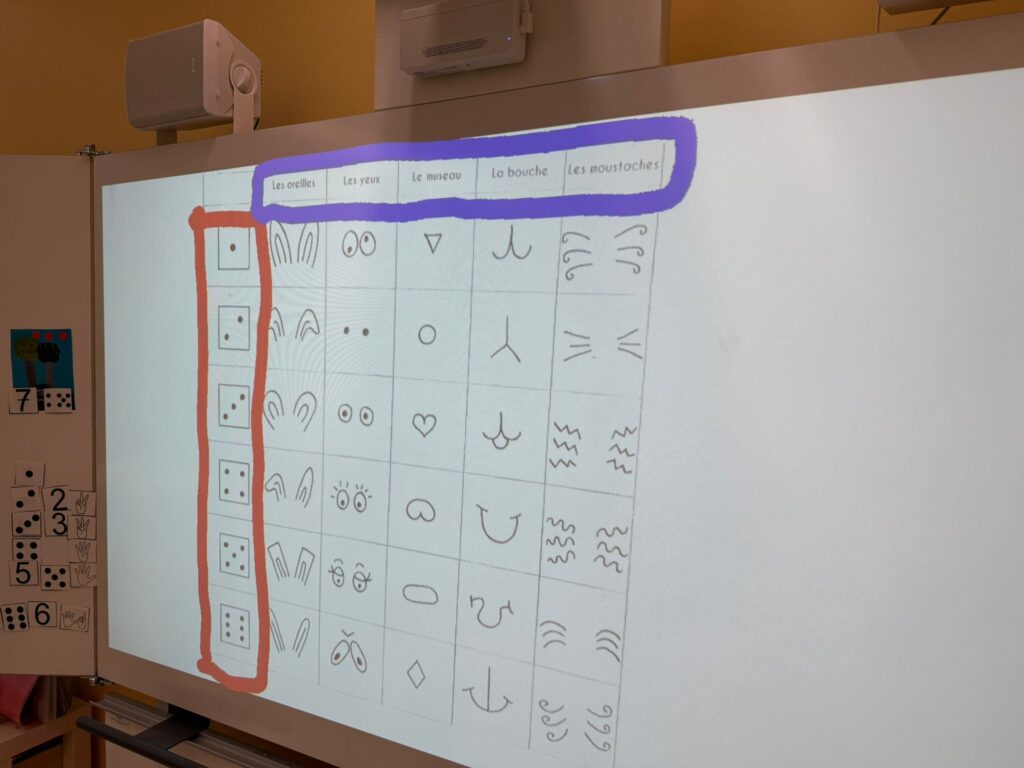 8h25 : Mathématiques : découverte du tableau à double entrée. Introduction en groupe, suivie d’ateliers