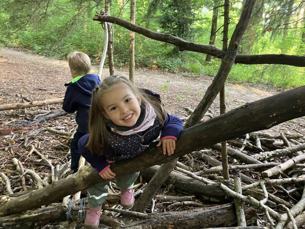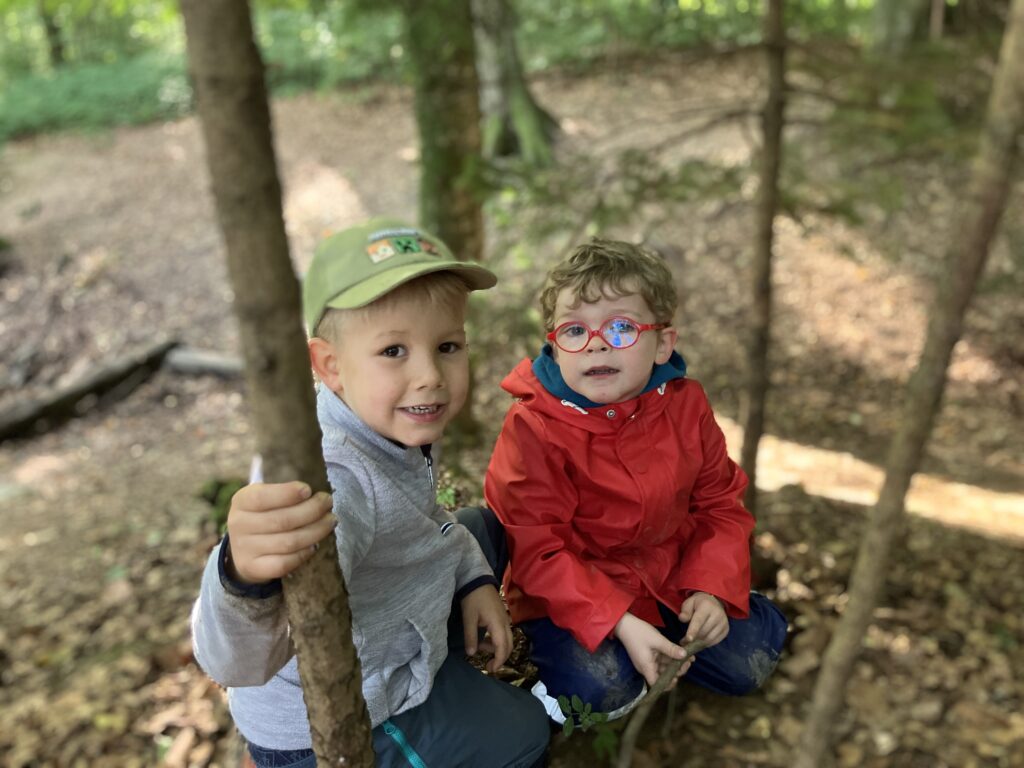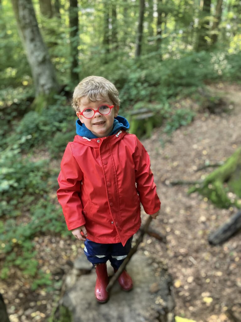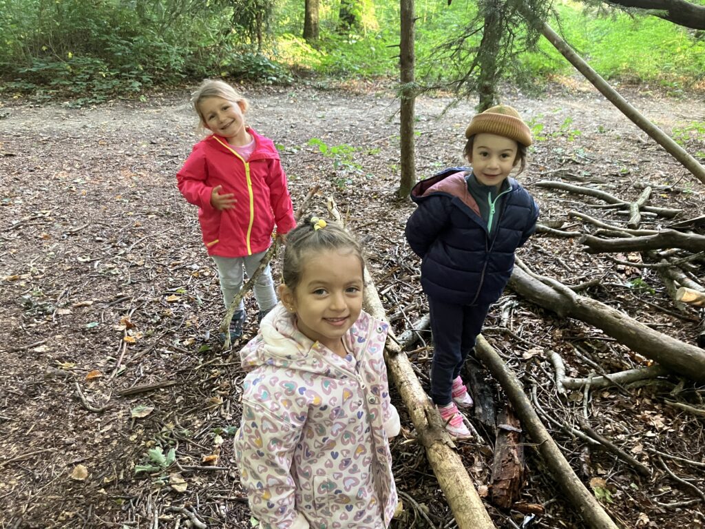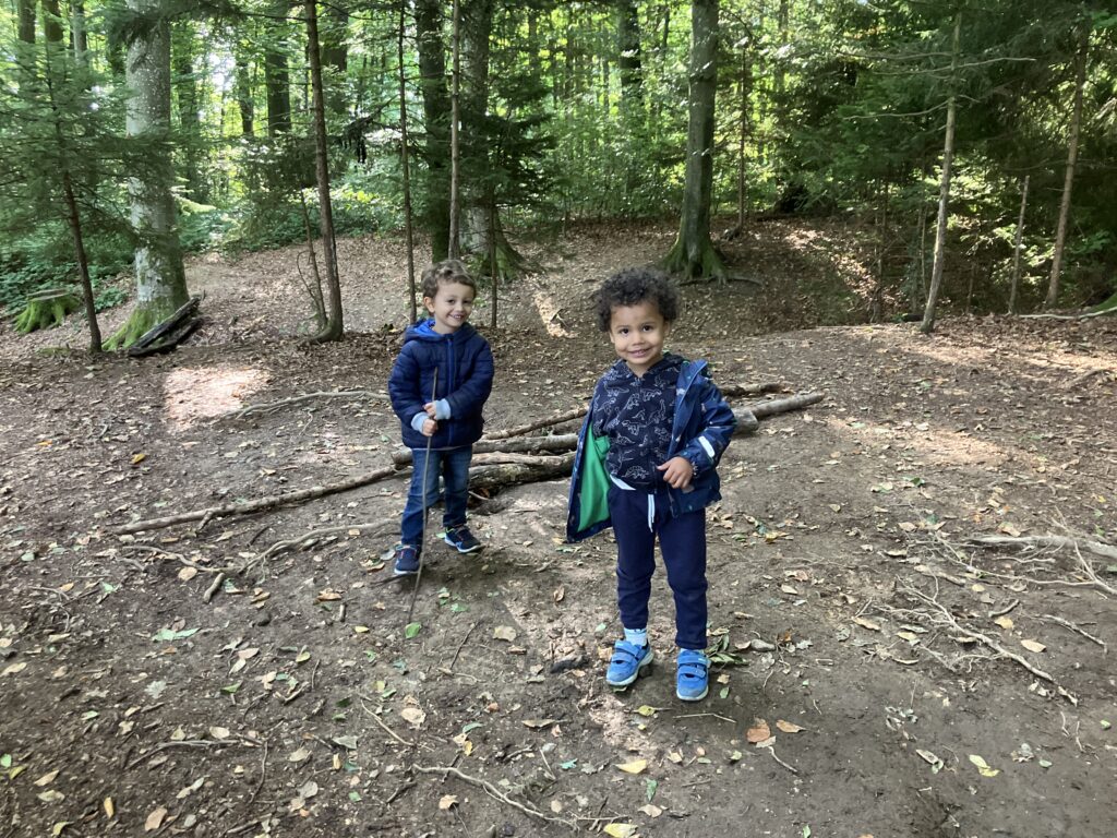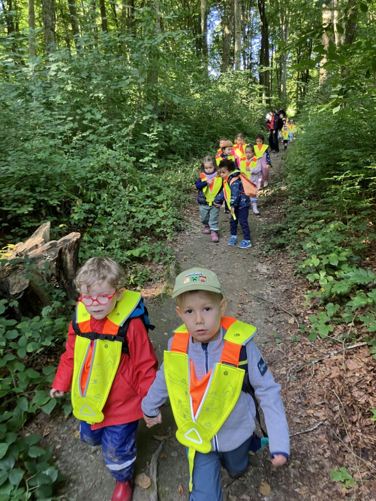 Wir sind zu Fuss bis in den Belle-Croix Wald gelaufen. Dort haben wir das Znüni gegessen und gespielt. Am Schluss sind wir dann wieder in die Schule zurückgelaufen. Es war ein schöner erster Morgen im Wald.